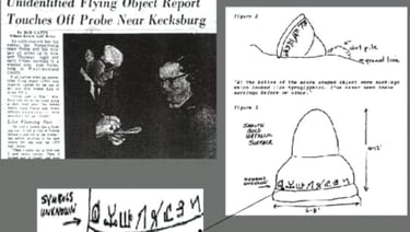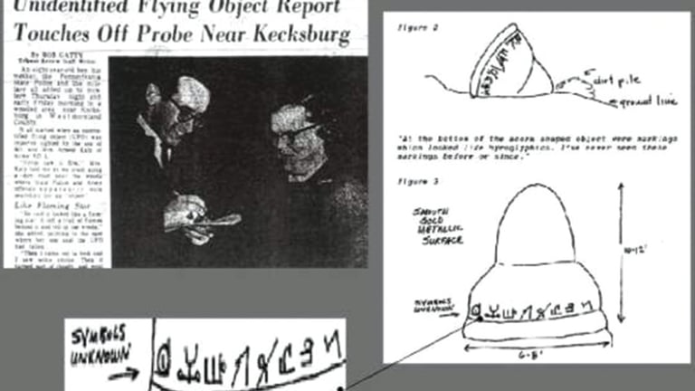 Feticcio della “ghianda” di Kecksburg e articolo del giornale dell’epoca con disegno, ricavato dai testimoni, del presunto oggetto schiantatosi