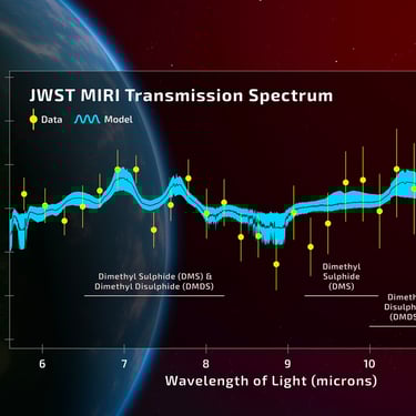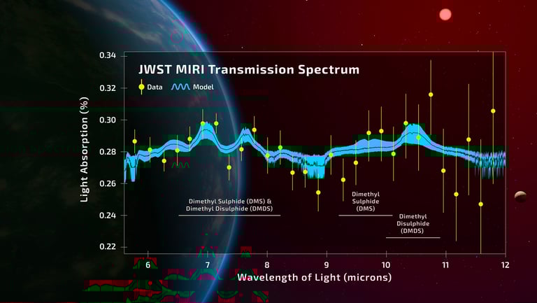Ed eccoci al cuore della notizia. Le osservazioni più recenti con lo strumento MIRI di JWST (nel range 6-12 micrometri) hanno rivelato caratteristiche spettrali che, secondo il team guidato da Nikku Madhusudhan dell'Università di Cambridge, sono meglio spiegate dalla presenza di dimetilsolfuro (DMS) e/o del suo parente chimico, il dimetildisolfuro (DMDS). Queste due molecole hanno firme spettrali simili in questa regione, quindi distinguerle nettamente è difficile con i dati attuali.